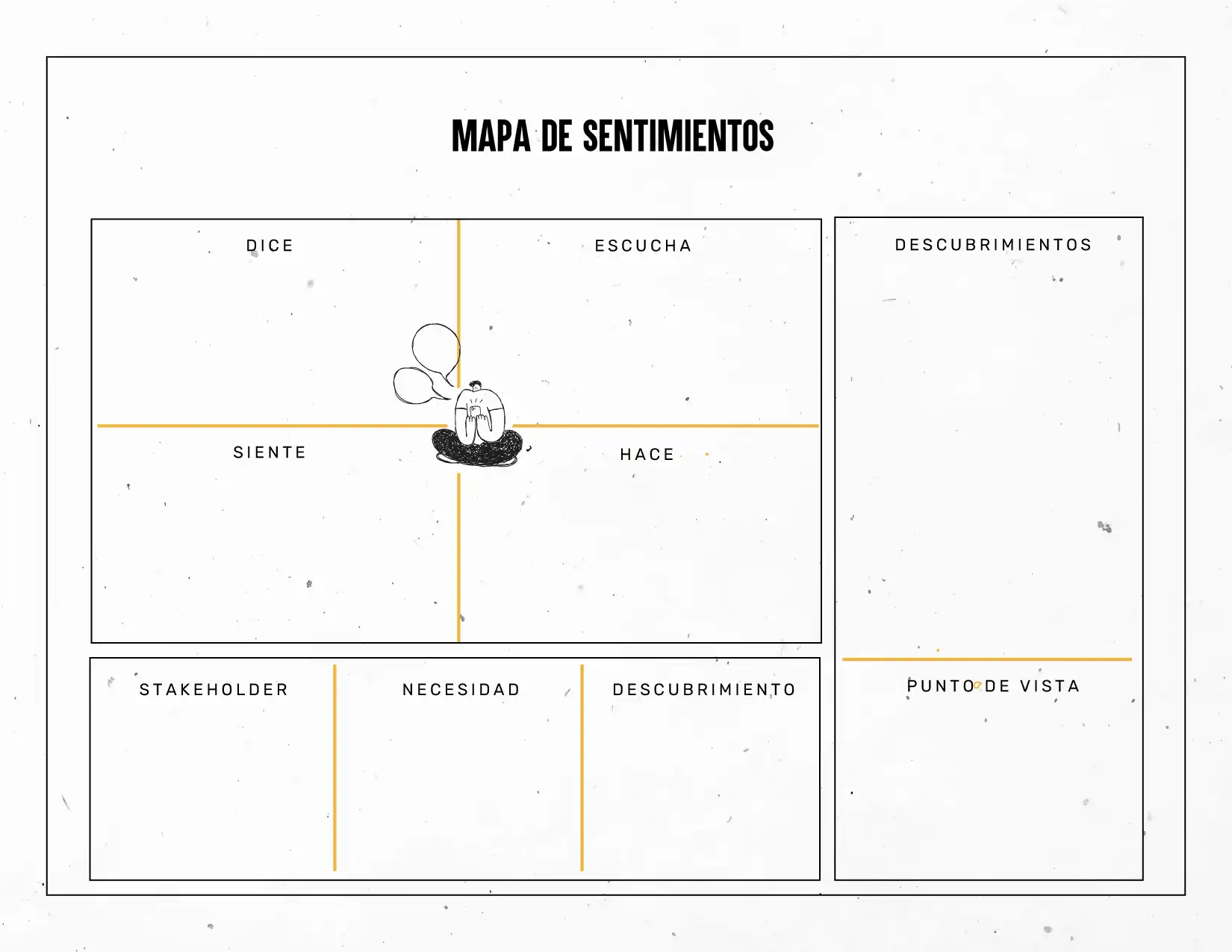 El mapa de sentimientos es una herramienta que permite anotar todos los hallazgos encontrados en el trabajo de campo con los stakeholders. Este mapa busca entender los comportamientos pero sobre todo descubrir los sentimientos para determinar las grandes pistas que nos lleven a los grandes descubrimientos (Insights).