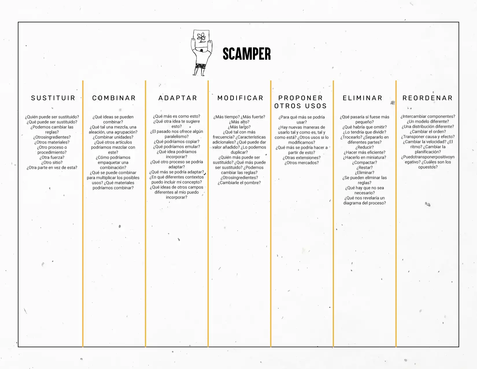 El método SCAMPER es una técnica creativa que consiste en generar ideas con base en diferentes determinantes. El objetivo es encontrar nuevos enfoques sobre el objetivo analizado. Esta metodología permite que las personas se enfrenten de forma innovadora y original a diversos problemas empresariales.